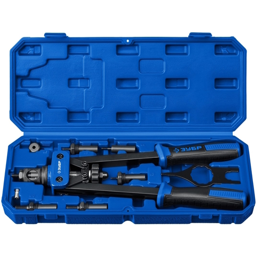 Резьбовой двуручный заклепочник в кейсе ЗУБР Профессионал Р-М10 М3 - М10 31056 предназначен для профессиональной эксплуатации. Подходит для заклепок М3-М10. Литой усиленный корпус инструмента повышает его надежность и долговечность. Двуручный заклепочник ЗУБР Профессионал Р-М10 имеет двухрычажную конструкцию, что многократно уменьшает прилагаемое усилие и снижает утомляемость при длительной работе. Вытяжной механизм изготовлен из закаленной стали и обеспечивает высокий ресурс работы. Специальная рукоять для выкручивания резьбового стержня из установленной заклепки.