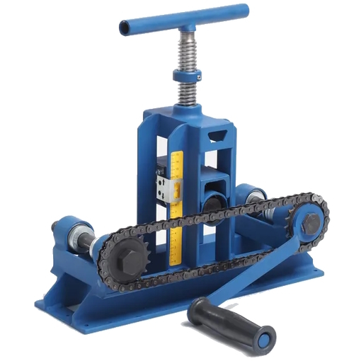 Цепной привод. Прокат профиля в 2 раза быстрее и легче. Для профилей и круглых труб. Спец. валы для круглых труб. Профиль - от 10х10 до 60х40 мм. Увеличенные валы. Заводская закалка. 16 подшипников: 10 - на валах, 1 опорный и 5 дополнительных подшипников на центральном валу. Улучшенная модель! Усиленная цепь. Винт TR27 с трапецеидальной резьбой.