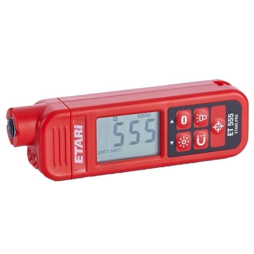 Толщиномер ЕТ 555 разработан в Германии. У ЕТ-555 есть встроенные фонарик и ультрафиолет. Обновленный процессор и датчик обеспечивают быструю и точную работу прибора при любых температурах от –25С до +50С.
